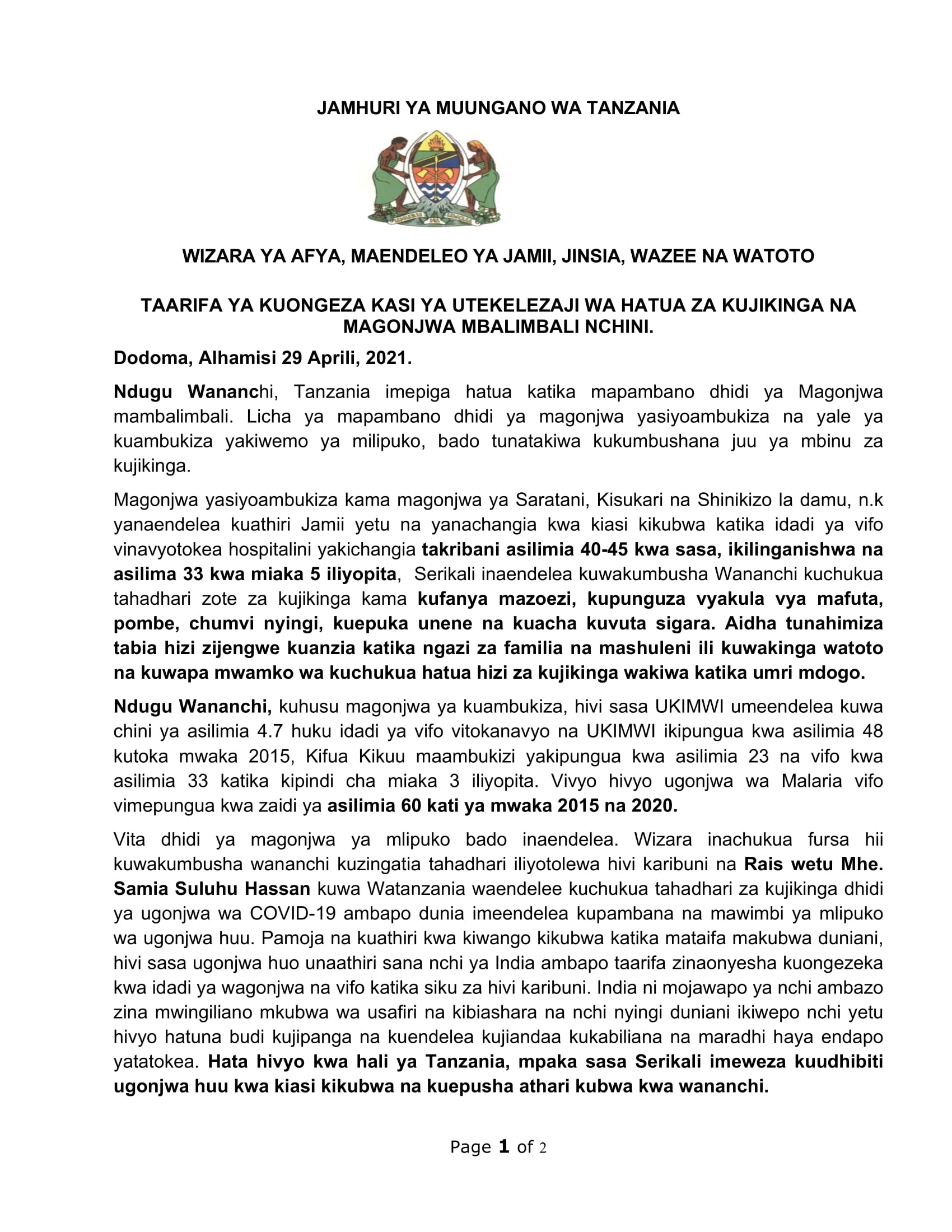 Akielezea kuhusiana na mradi huo, Waziri wa Afya, Maendeleo ya Jamii, Jinsia, Wazee na Watoto Dkt Dorothy Gwajima alisema, “Serikali inafanya mapinduzi makubwa na makini katika kuhakikisha kuwa ubora wa huduma za afya kwa watu wote zinaimarishwa na kutolewa kwa wakati na ufanisi. Na kwa kuwa magonjwa yasiyoambukiza yana njia za kuzuia ikiwamo kufanya mazoezi, basi amewashajihisha watanzania kujua njia za kujikinga na kufanya mazoezi kwa wingi.